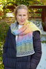 Waves of stripes ripple across in alternating bands of shifting color on a solid background alternating with bands of star flowers in this rectangular scarf.